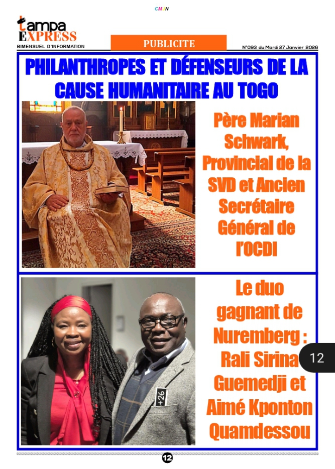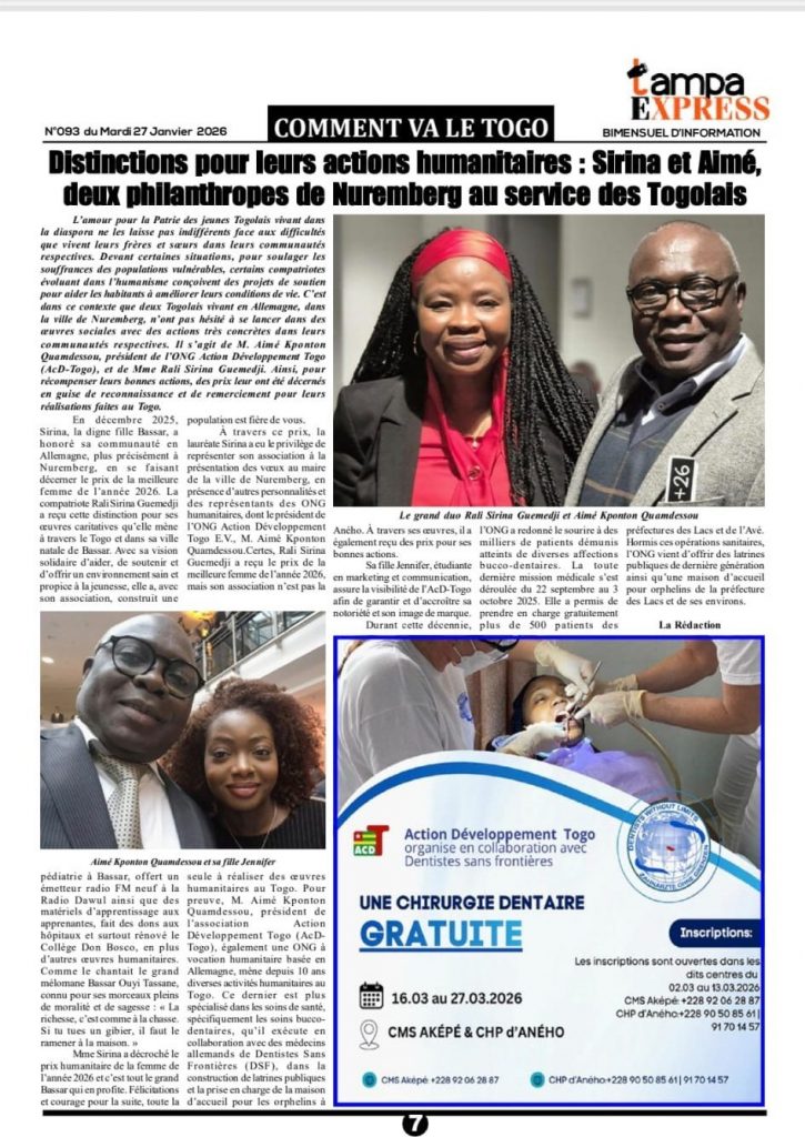 Wie auch in den Medien berichtet, wurde unser anhaltendes humanitäres Engagement in Togo zuletzt in der Januar-Ausgabe der Zeitung Tampa Express hervorgehoben. Dabei wurden insbesondere unsere laufenden zahnmedizinischen Hilfseinsätze in Zusammenarbeit mit Zahnärzten aus Deutschland sowie der Einsatz unserer Projektleitung gewürdigt.